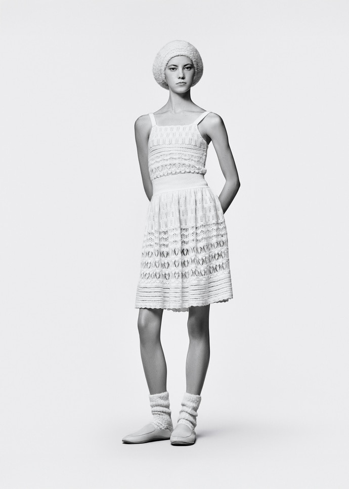 Exuding a sense of relaxed sophistication, this top is worked in a delicate lace stitch. Classic and feminine, its Lacely Fantasy yarn intertwines Mongolian cashmere with a silk core and is brushed to reveal its featherlight volume and sensorial softness. The garment is designed to pair effortlessly with other creations from the Cocooning selection.